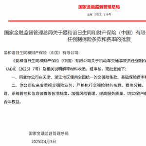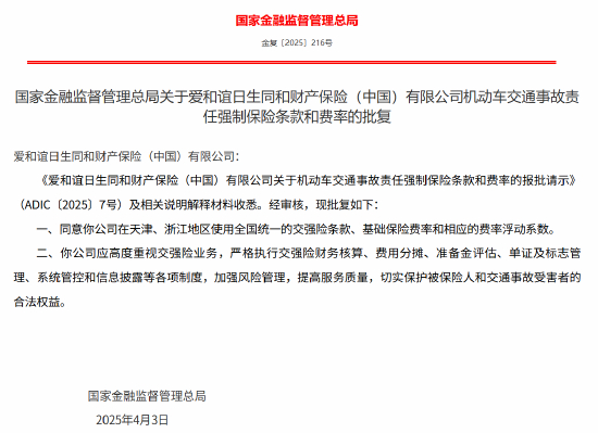 4月14日金融一线消息,国家金融监管总局发布关于爱和谊日生同和财产保险(中国)有限公司机动车交通事故责任强制保险条款和费率的批复,同意该公司在天津、浙江地区使用全国统一的交强险条款、基础保险费率和相应的费率浮动系数。