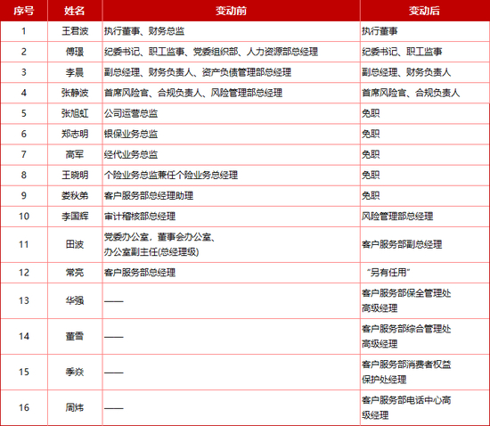 履新的7人中,审计稽核部总经理李国辉接替张静波成为风险部总经理;田波从党办公室、董事会办公室及办公室副主任(总经理级)调至客户服务部出任副总经理;客户服务部4个分支部门分别由华强、董雪、季焱、周炜担任保全管理处、综合管理处、消费者权益保护处、电话中心高级经理。此外,原客户服务部总经理常亮显示为“另有安排”。
