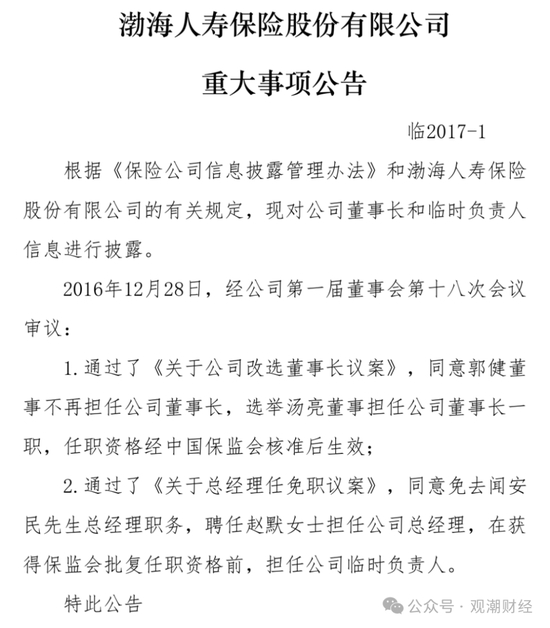 仅两年后,在2017年1月渤海人寿发布公告称,于2016年12月28日同意郭建的离职并选举汤亮为董事长,同时,免去闻安民的总经理职务,聘任赵默担任总经理,在任职资格的批复下来之前赵默任临时负责人。