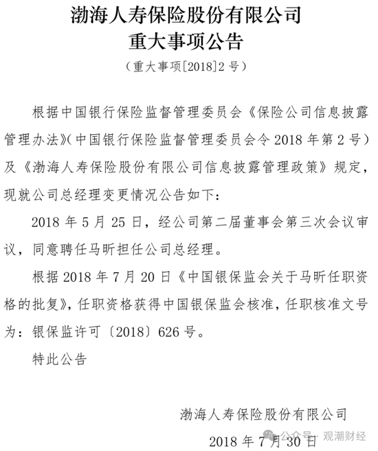 2018年7月30日,渤海人寿发布公告称,5月25日,该公司聘任马昕担任公司总经理,并已于7月20日获得批复。至此,渤海人寿第二任总经理终于落定并走马上任。