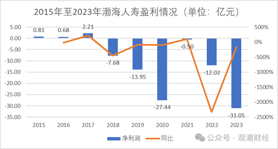 其次从盈利情况来看,该公司自成立次年起至2017年连续三年盈利,2018年起渤海人寿由盈转亏并持续至2023年,6年总共亏损92.64亿元。