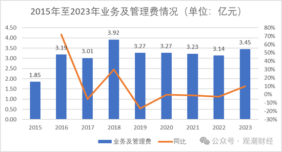 与前面两项支出相比,该险企的业务及管理费则相对稳定,自2016年以来一直维持在3亿元左右。