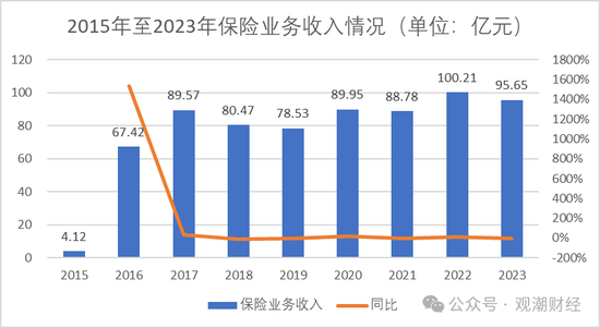 从承保端来看,2015至2017年,该险企的保险业务收入稳步上涨,2018年出现了第一次下挫,同比下降10.16%。而后至2023年,该险企的保险业务收入增长几乎处于停滞状态。