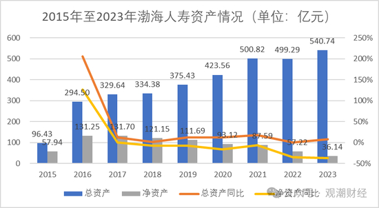 首先从资产情况来看,渤海人寿自2015年至2023年之间,总资产整体趋势保持增长。2022年小幅下降了1.53亿元,同比下降0.3%,2023又再次增长至540.74亿元,同比增加8.30%。