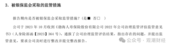 2021年一季度起,渤海人寿的风险综合评级开始由B滑落至C,此后直至2023年三季度连续11季度该险企的风险综合评级一直为C。而在2023年四季度的偿付能力报告中,该险企已被原银保监会采取监管措施。