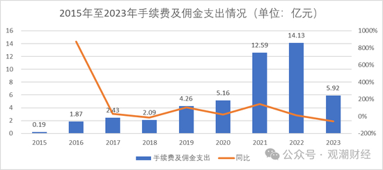 从手续费及佣金支出来看,除2021年、2022年增幅较大,超过10亿元外,其他年份均低于10亿元。相比前2年,2023年该项费用支出大幅下降至2020年水平。