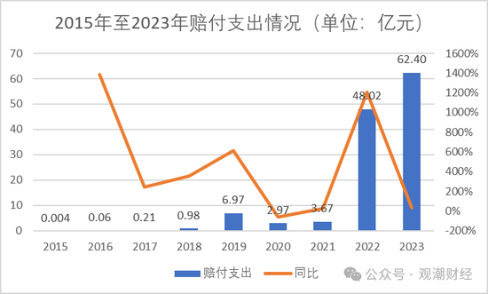 赔付支出来看,成立后至2021年其数值一直稳定在10亿元以下水平。2022年,突然飙升至48.02亿元,同比增长1210.14%,次年继续增加至62.40亿元。