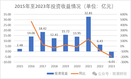 从投资端来看,该险企投资收益基本在15亿上下,仅在2021年出现高达32.81亿元的峰值。随后两年连续下滑,2023年投资亏损6.01亿元。