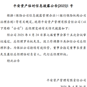 4月30日金融一线消息,平安资管今日发布公告称,经公司2025年4月24日第七届董事会第十五次会议审议通过,罗水权因工作调整不再担任公司总经理职务。为保证公司持续有效经营,董事会指定董事长黄勇兼任总经理临时负责人,代行总经理职权。