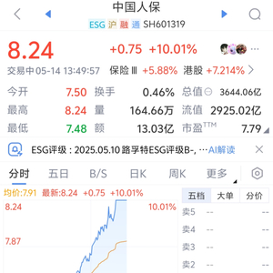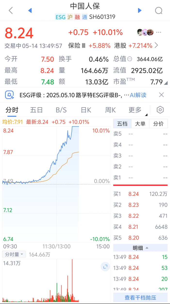 5月14日金融一线消息,保险股爆发,中国人保涨停,中国太保涨超9%,新华保险、中国人寿、中国平安跟涨。