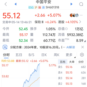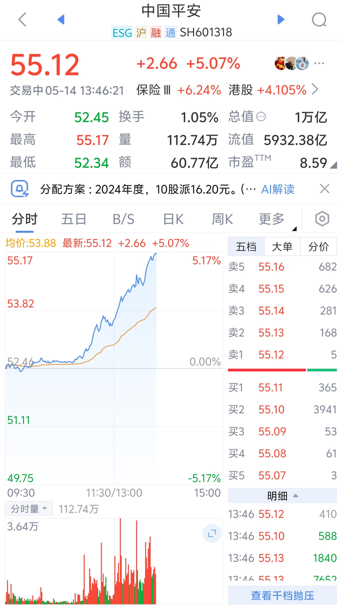 中国平安涨超5%,总市值重回1万亿元