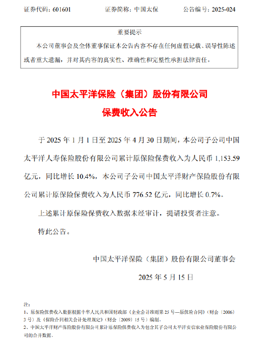 5月14日金融一线消息,中国太保公告,于2025年1月1日至2025年4月30日期间,本公司子公司中国太平洋人寿保险股份有限公司累计原保险保费收入为人民币1,153.59亿元,同比增长10.4%,本公司子公司中国太平洋财产保险股份有限公司累计原保险保费收入为人民币776.52亿元,同比增长0.7%。