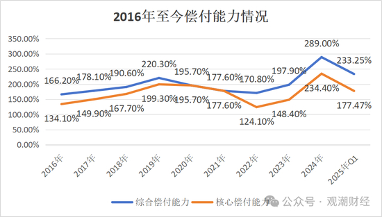 偿付能力来看,随着业务的迅猛发展其偿付能力消耗明显。截至2025年1季度,中荷人寿核心偿付能力、综合偿付能力分别为177.47%、233.25%,分别较2024年四季度末下降56.93%、55.75%,该险企实际资本较上季度减少15.51亿元。