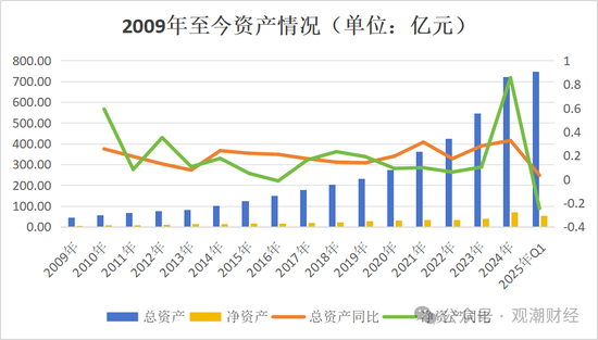 经营数据显示,中荷人寿成立至今,总资产已从最初的45.31亿元增至747.48亿元,资产规模扩大了超16倍。净资产也随之扩大,除2016年以及今年一季度负增长外,已从5.3亿元增至53.76亿元。如果除去2025年一季度,仅看年度数据,中荷人寿净资产在2024年末已达71.3亿元,较2023年同比大增超8成。