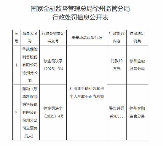 同时,颜颂(原华凯保险销售股份有限公司徐州分公司主要负责人)因利用业务便利为其他个人牟取不正当利益,被警告并罚款4万元。