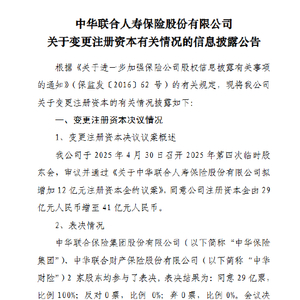 5月16日金融一线消息,中华联合人寿保险股份有限公司发布公告称,公司审议并通过了《关于中华联合人寿保险股份有限公司拟增加12亿元注册资本金的议案》,同意公司注册资本金由29亿元增至41亿元。