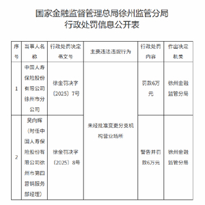 国寿寿险徐州市分公司被罚6万元:未经批准变更分支机构营业场所