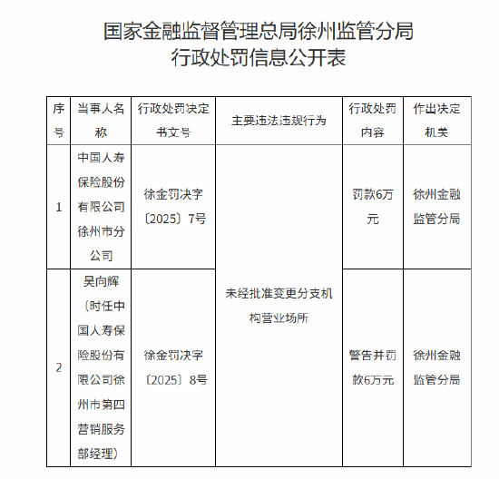 同时,吴向辉(时任中国人寿保险股份有限公司徐州市第四营销服务部经理)因未经批准变更分支机构营业场所,被警告并罚款6万元。