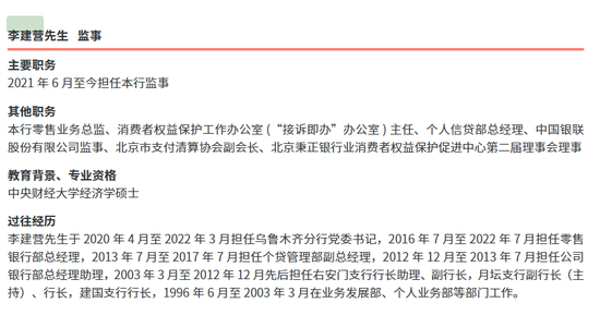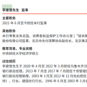 李建营出生于1971年,毕业于中央财经大学,取得经济学硕士,加入北京银行将近30年。履历显示,李建营于1996年加入北京银行,先后在业务发展部、个人业务部等部门工作。2003年3月起,李建营调至支行任职,先后担任右安门支行行长助理、副行长,月坛支行副行长(主持)、行长,建国支行行长等职。2012年12月,在北京银行历任银行部总经理助理、个贷管理部副总经理、零售银行部总经理等职。2020年4月起担任乌鲁木齐分行党委书记。一年之后起任改行监事。此外,李建营还兼任北京银行零售业务总监、消费者权益保护工作办公室主任、个人信贷部总经理等职。值得一提的是,李建营作为北京银行监事,去年从领取的税前报酬总额达到217.49万元。