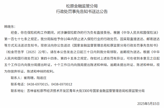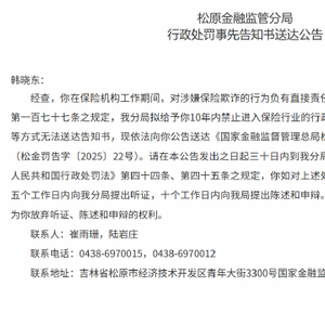 5月21日金融一线消息,据国家金融监督管理总局松原监管分局行政处罚信息显示,韩晓东因在保险机构工作期间对涉嫌保险欺诈的行为负有直接责任,拟被给予10年内禁止进入保险行业的行政处罚。