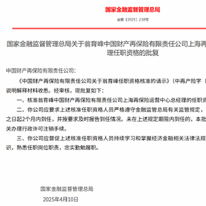 翁育峰中再产险上海再保险运营中心总经理的任职资格获核准 金融一线 2025.05.2114:02 关注 5月21日金融一线消息,国家金融监督管理总局发布批复公告,核准翁育峰中国财产再保险有限责任公司上海再保险运营中心总经理的任职资格。