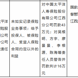 5月23日金融一线消息,中国太平洋人寿保险股份有限公司江西分公司因未如实记录保险业务事项;给予投保人、被保险人、受益人保险合同约定以外的利益,被罚款43万元。吴根明、方宇、廖景景、李根源、陈海等责任人员受到警告并被罚款共计16万元。