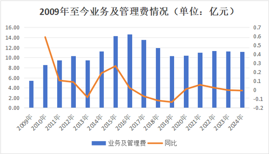 从“业务及管理费”来看,近几年该指标相对较稳定但也逐步缩减,且近6年水平普遍低于“信达期”的2015-2018年期间。近7年平均在11亿元左右,2024年为11.20亿元,同比微减0.7个百分点。
