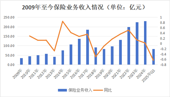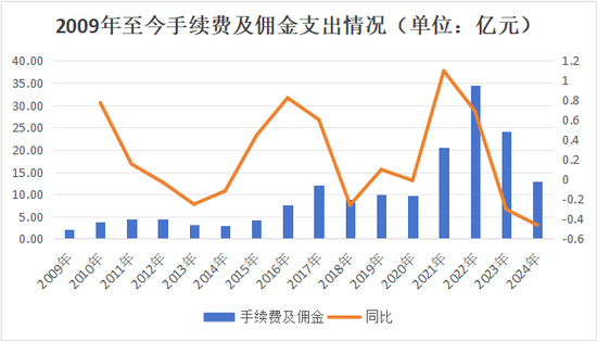 从“手续费及佣金支出”来看,2021年-2022年随着业绩的迅猛发展,费用支出也跟着水涨船高,呈现成倍增长,2022年达历年最高34.51亿元。但与赔付支出类似,近两年该指标也在持续下滑,2024年达12.92亿元,同比下降46.29%,与2017年水平近似。