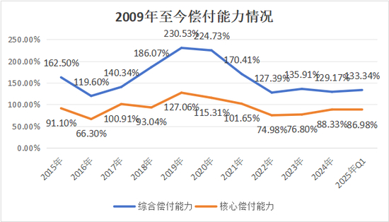 偿付能力来看,该险企以2019、2020为中段,两端呈拱桥形,在股东转换资本增加短暂提振后,近年随着业务的高速增长幸福人寿偿付能力不断消耗,虽未低于监管的重点关注线,但整体高出不多。截至2025年1季度,幸福人寿综合偿付能力、核心偿付能力分别为133.34%、86.98%。