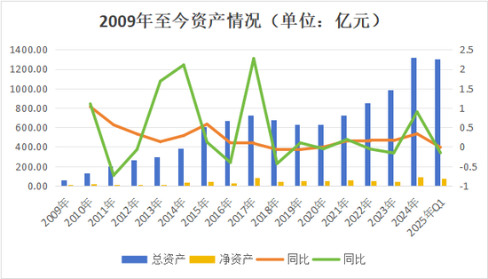 整体来看,幸福人寿的净资产一直处于高低起伏之中,总资产也大概呈一致趋势。与前一年相比,2024年总、净资产均有大幅度提升,但该数据在2025年均有一定程度下降。今年一季度总资产同比微减1.22个百分点;净资产73.72亿元,同比下滑15.23%。