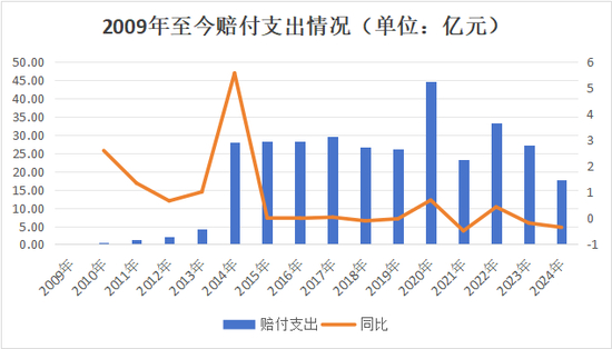 首先从“赔付支出”来看,2024年仅17.79亿元,同比下降34.67%,为近11年最低。
