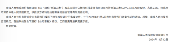 具体来看,幸福人寿2025年一季度偿付报告中虽未披露股权变动,但据其官网2024年11月12日股东股权披露事项,股东深圳市亿辉特科技所持幸福人寿46599.3336万股股份、占比4.6%,经北京市第四中级人民法院裁定,以抵债方式转让给存款保险基金管理有限责任公司。