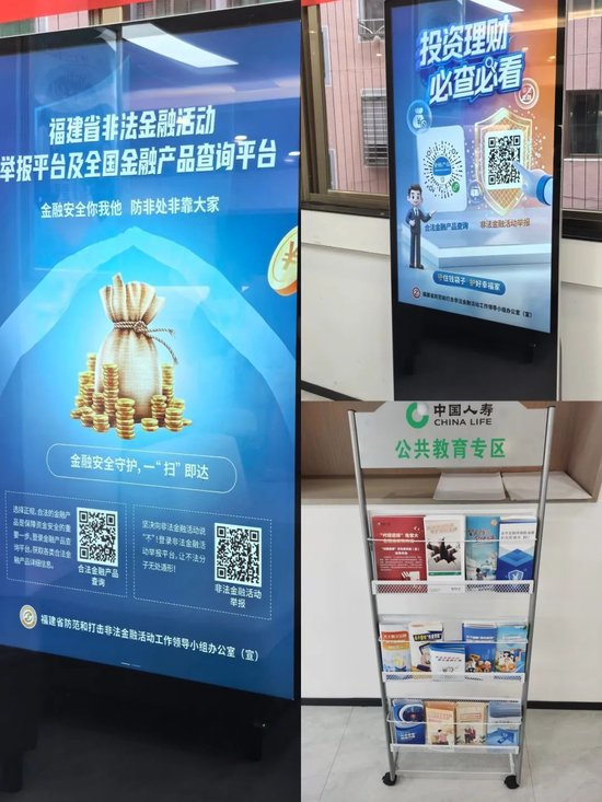 中国人寿寿险霞浦县支公司在公共场所及营业大厅,通过LED显示屏及数字化标牌滚动播放防非宣传标语及宣传片,在营业大厅醒目位置摆放宣传折页,确保最大程度触达广大群众,无论是前来办理业务的客户,还是路过网点的行人,都能直观地接收到防非信息。LED屏幕滚动展示非法金融活动,如“全民防非金融守护”“守住钱袋子·护好幸福家”“全民防非行业守护”“天上不落高息饼 非法金融是陷阱”等内容让过往群众清晰了解非法金融活动的本质,能够快速识别风险,提高警惕。