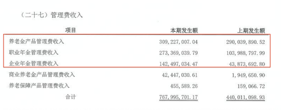以2024年为例,人保养老管理费收入达到了7.68亿元,同比大增74.55%,所占总营收的比重高达78.61%。其中,养老金产品管理费收入为绝对贡献主力,达到了3.09亿元,同比增长6.55%;其次则是职业年金和企业年金,管理费收入分别为2.73亿元、1.42亿元,同比分别大幅增长了162.5%、222.73%,增速远超养老金产品,成为带动当年收入增长重要分支力量。