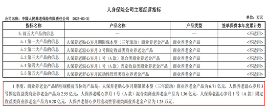 值得一提的是,今年一季度,以上商业养老金产品累计销售规模也是在人保养老所有险种中排名前五位,销售规模分别达6.71亿元、2.55亿元、1.36亿元、0.28亿元及1.25万元。