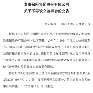 6月23日,泰康保险集团发布一则公告,宣布公司不再设立监事会。