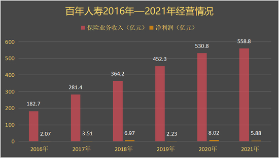 资本加持下,百年人寿经营情况一度“扶摇直上”。根据历年年报数据,2016年-2021年,百年人寿的保险业务收入为182.7亿元、281.4亿元、364.2亿元、452.3亿元、530.8亿元、558.8亿元;净利润分别为2.07亿元、3.51亿元、6.97亿元、2.23亿元、8.02亿元及5.88亿元。