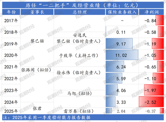 2018年12月21日,该公司曾指定董事长黎已铭为临时负责人,代行总经理职权;不足一年,又指定副总经理于致华担任临时负责人,主持工作长达2年时间,但最终也未转正。根据三峡人寿2023年二季度偿付能力报告,于致华不再担任三峡人寿副总经理职位。