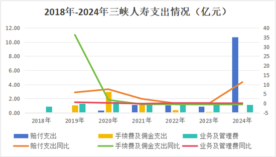赔付支出方面,2021年-2023年间,三峡人寿赔付支出均在1亿元左右,但2024年末,该公司赔付支出暴增至10.71亿元,同比增长过千。