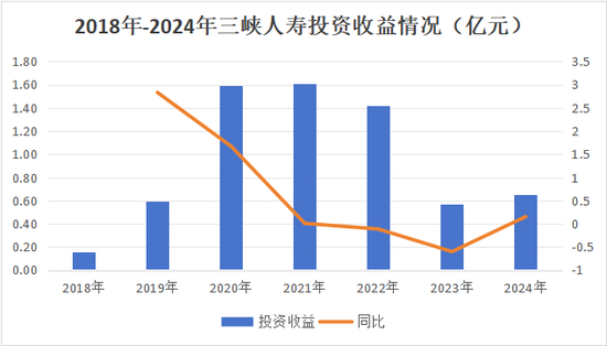 从投资端来看,三峡人寿投资收益整体变动较大。除2020年-2022年在1.5亿元左右,此后2023年、2024年拦腰斩断,均处于0.6亿元左右。
