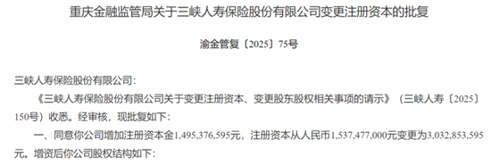 6月27日,监管发布关于三峡人寿增加注册资本14.954亿元的批复,该公司注册资本由15.375亿元增加至30.329亿元。这是继2023年12月,三峡人寿完成第一轮增资扩股、转为重庆市属国有金融企业后,再次进行增资。