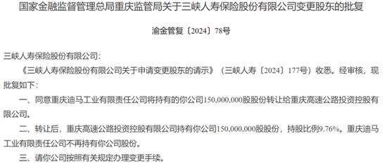 同时,观潮财经注意到,该公司原股东重庆迪马工业于去年6月转让其所持有的9.76%股份,受让方为重庆高速公路投资公司,转让后重庆迪马工业不再持有三峡人寿股份。而在三峡人寿本次增资中,重庆高速投资控股再次出资4.6亿元,持股比例由9.76%增至20.07%,成为第二大股东。