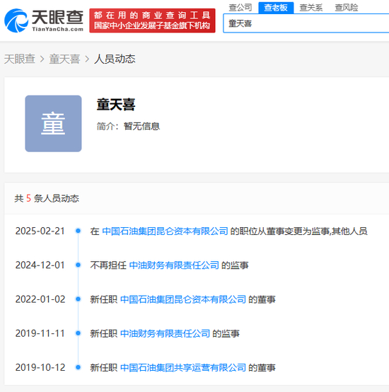 天眼查显示,2019年10月,童天喜担任中国石油集团共享运营有限公司董事,次月,又履新中油财务监事。2022年1月,新任中国石油集团昆仑资本董事。2025年2月,再出任中石油集团昆仑资本监事会主席。2025年4月,童天喜拟任中意人寿董事长、党总支书记。
