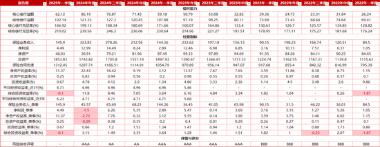 2025年第一季度,中意人寿保险业务收入为145.9亿元,同比增长1.07%。净利润4.49亿元,同比增长55.36%。投资收益率为0.67%,综合投资收益率为-0.1%。一季度末中意人寿综合偿付能力充足率从期初的 239.56%降低到期末的 210.02%,核心偿付能力充足率从期初的199.13%降低到期末的 166.92%。最近两次风险综合评级结果均为AA级。总资产1853.83亿元,较年初增长6.3%。净资产为48.03亿元,较年初增长55.39%。