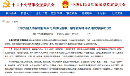 2024年11月,中央纪委国家监委网站披露消息显示,工银安盛人寿执行董事、副总裁陶仲伟涉嫌严重违纪违法,任上被查。