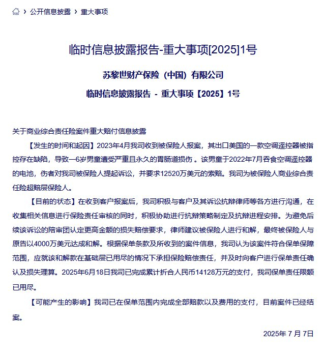 根据保单条款及所收到的案件信息,苏黎世财险(中国)认为该案件符合保单保障范围,应就该和解款在基础层已用尽的情况下承担保险赔偿责任,并及时向客户进行保单责任确认及损失理算。2025年6月18日该公司已完成累计折合人民币14128万元的支付,保单责任限额已用尽。