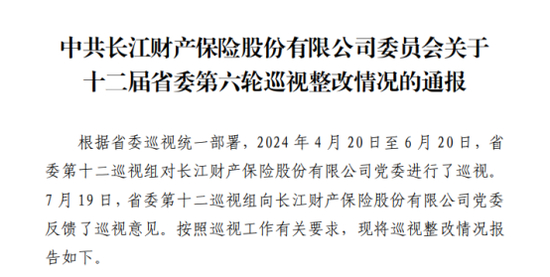 据了解,根据湖北省委巡视统一部署,2024年4月20日至6月20日,湖北省委第十二巡视组对长江财险党委进行了巡视。同年7月19日,第十二巡视组向该公司党委反馈巡视意见。2025年6月25日,该公司发布《通报》对外公布其巡视整改情况。