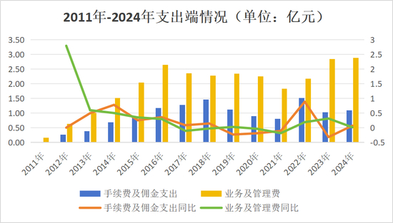 而长江财险手续费及佣金支出、业务及管理费2指标,近两年则呈现上升趋势。2024年,长江财险手续费及佣金支出、业务及管理费分别为1.10亿元、2.88亿元,分别同比上升6.74%、1.27%。