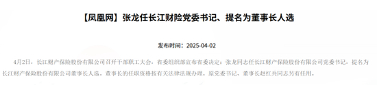 仅一年后的2025年4月2日,长江财险官网再次发布消息,省委组织部宣布省委决定:张龙同志任长江财险党委书记,提名为该公司董事长人选。而原党委书记、董事长赵红兵同志另有任用。