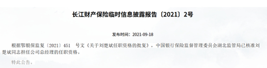 3年3换临时负责人,叠加因2020年年初新冠疫情,原董事长杨晓波因病去世,长江财险一度面临高管动荡局面。直至2021年9月,现任总经理刘楚斌正式上任,结束了该公司总经理职位4年的空缺。